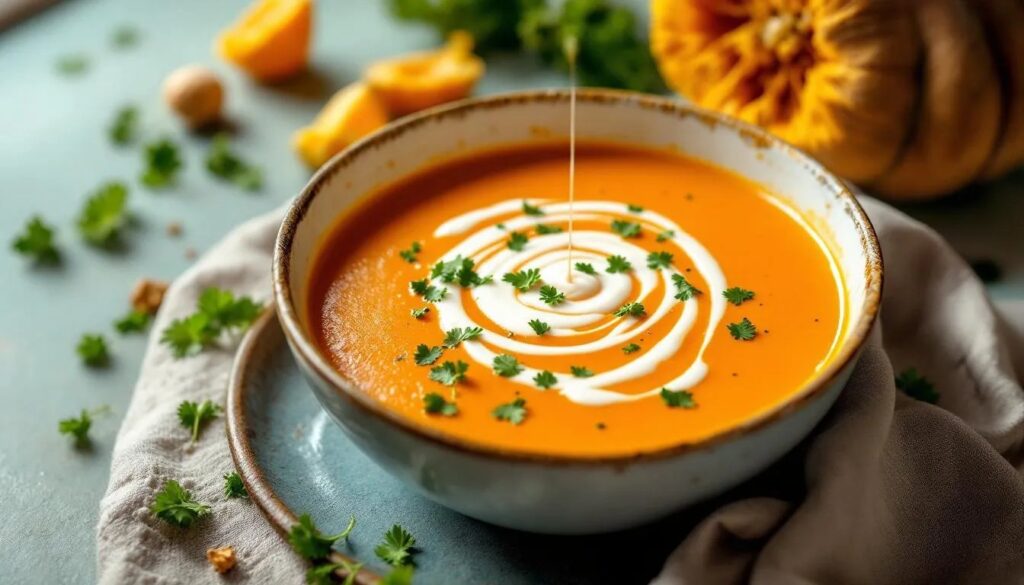 Servid la crema bien caliente en boles hondos precalentados —un bol frío baja la temperatura del plato en segundos. Dibujad un hilo de leche de coco reservada sobre la superficie con una cuchara, dispersad unas semillas de calabaza tostadas para aportar contraste crujiente, y terminad con cebollino fresco picado. La diferencia visual entre la naranja intensa de la crema y el blanco de la leche de coco actúa como señal sensorial antes del primer sorbo.