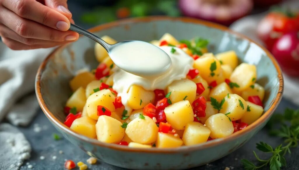 La patata nueva que aparece en los mercados vascos a finales de marzo tiene la piel muy fina y un contenido en agua ligeramente superior al de la patata de conserva. Por eso, en primavera, conviene reducir la mayonesa en un 10 % respecto a la proporción estándar y compensar con una cucharadita de mostaza de Dijon antigua, que aporta cuerpo y un leve toque ácido sin enmascarar el conjunto. También hay bares que añaden una cucharada de la propia agua de cocción de las patatas —muy salada, con almidón disuelto— directamente a la mayonesa antes de mezclar: el almidón actúa como estabilizante natural y da una untuosidad diferente a la que se obtiene solo con aceite y huevo.